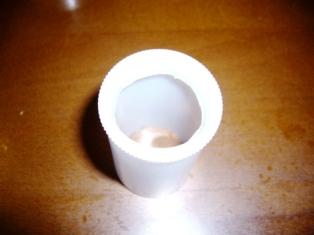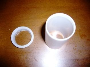 フィルムケースを1個用意し、底の部分をカットします。次に、ふたの部分に24.5ミリの穴をあけます。はい、出来上がりです。