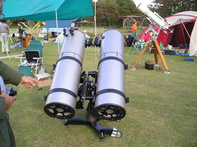 minoru さんの100mm反射双眼すごいですね。赤緯軸の両端にくっつける発想は快挙でしょう。屈折オフセット双眼は正立化とポルタ搭載で進化した姿を秩父で見せて戴き、私もかねてより考えていたグレードアップを実施してみました。架台はカスタム経緯台では強度不足で、ポルタも考えましたが、先を越されてしまい、SP赤道儀を90度にオッタテル暴挙を実行、おまけでSS2000の自動追尾、自動導入化になりました。自動化はナンセンスと言うご意見もありますが、寄る年波にはかてず。