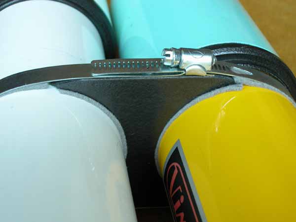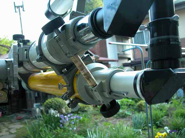 写真2:鏡筒先固定方法はminoruさんの方式を改良し筒間112mm固定冶具とホースバンドで固定。