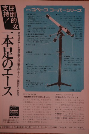カートン光学の話題が続いていましたので、私も投稿させていただきます。カートン光学の天体望遠鏡といえば、「一本足のエース」を抜きに語ることはできないでしょう。写真は、スペース77デラックスです。口径77ミリ、焦点距離1,250ミリです。アクロマートですが、fが大きいので色収差を感じません。ピラーは、重いのが弱点ですが、天頂付近の死角がなく使いやすいです。なにより、いかにも天体望遠鏡という感じのたたずまいが気に入っています。また、広告は、1970年8月号の天文ガイドに掲載されたものです。天文ファンからのアンケートによりピラーを採用したことが記されています。