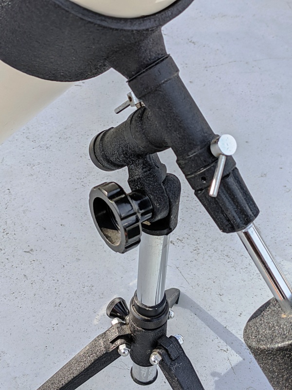 反射望遠鏡なら、鏡筒回転はほとんど無理です。また、三脚に比べ、エレベータを伸ばさないとしりもちをついて上に向きません。こりゃ、どうみても使えないと思ってましたが、地面において上から覗きこむ分には、覗けます。で、同じタイプの経緯台よりは、バランスがあっている分、置いたまま方向動かせます。