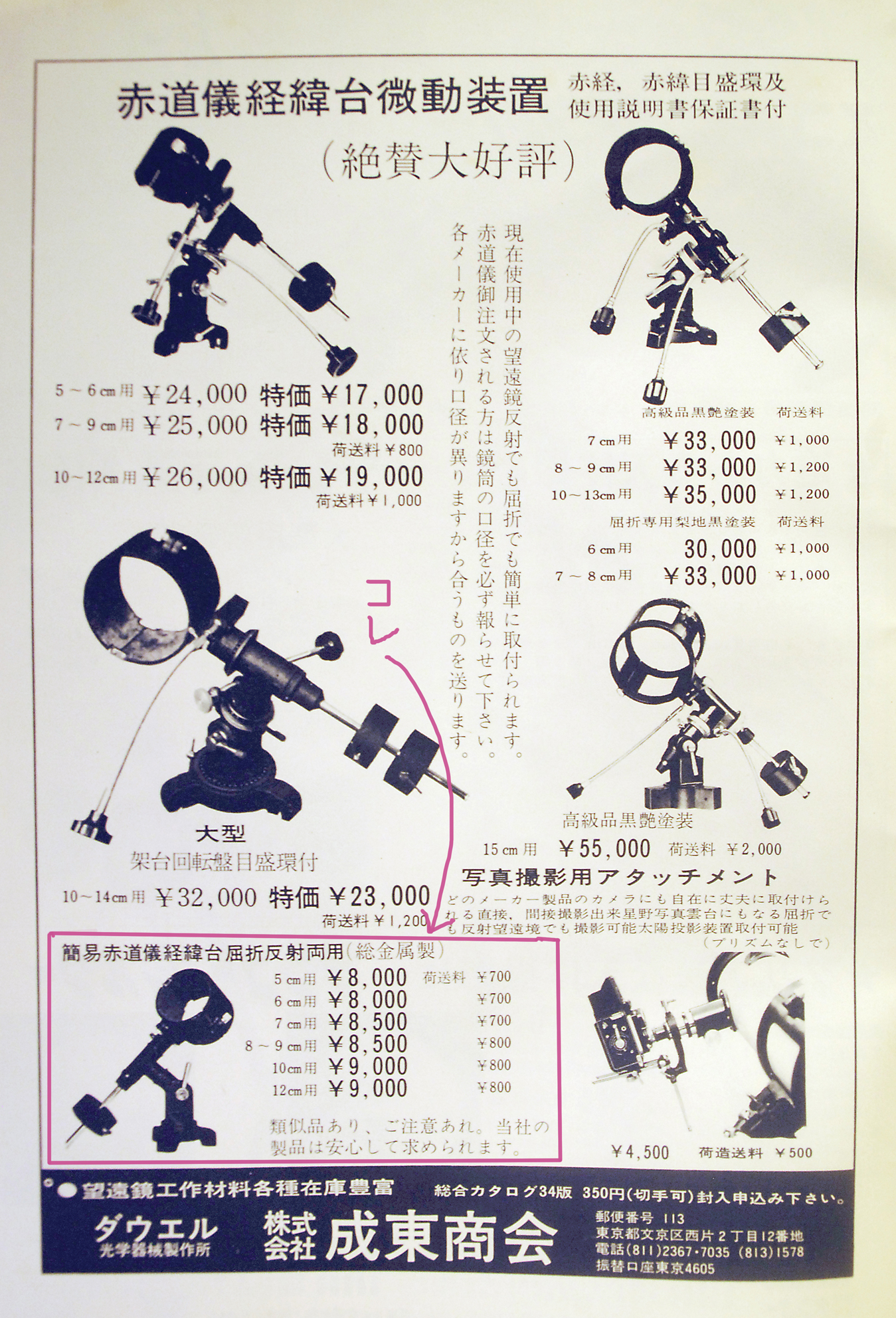 右上の赤道儀は今見ても格好良いなと思いますが、当時狙っていたのは左上の方です。小学生には数千円の差は