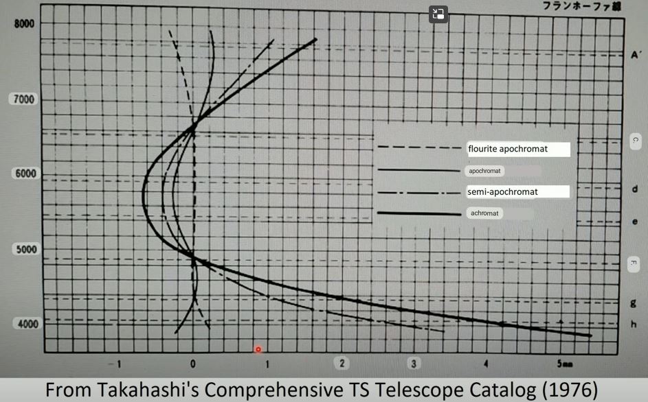 写真はTS-65Dです。 写真はレンズリングです。 高橋望遠鏡本昭和 51 年 (1976 ) のグラフは、高橋 蛍石 アポクロマート、アポクロマート、セミ アポクロマート、およびアクロマート レンズ設計のカラー フォーカスを示しています。