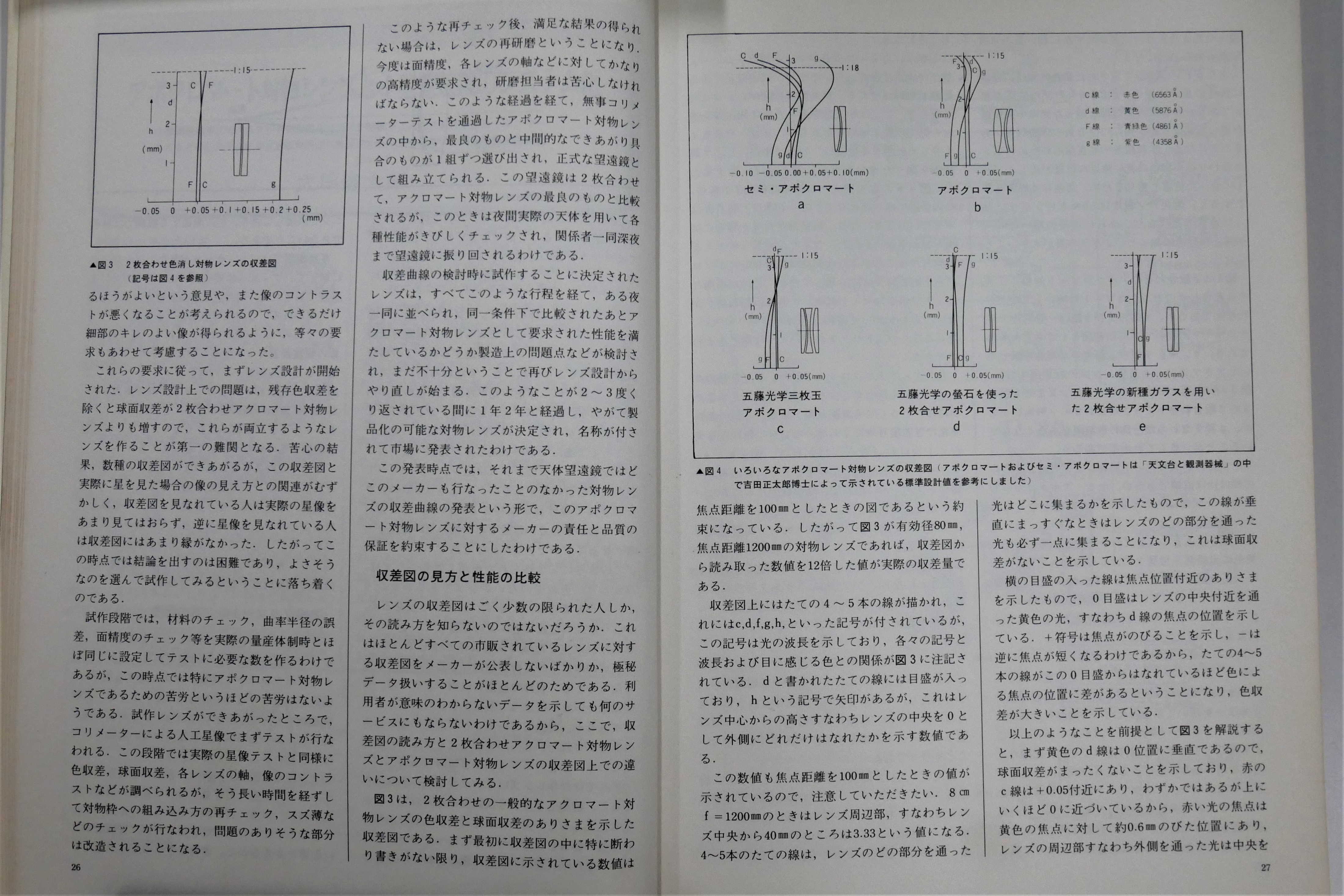 「まず、最近開発された各新種ガラスと、ドイツ・ショット社の新種ガラスの光学的性能を利用し、50余種類の光学設計を試み、その結果、国産新種ガラス利用が最良との結論に達し、小原光学硝子会社の技術部長等に相談したところ、写真用等と異なる大型材料だけに全体的な均質性の保証がむずかしいけれども、お互いの会社の名誉をかけてチャレンジしてみようと引き受けてくれて、数回の溶解アニールと、日本ではじめての「ホモ」条件まで満たした完璧なガラスの供給を受け・・・・ついに完成をみたものです。」 (天文ガイド1976年9月号五藤光学50年の成長 世界第一級20cmスーパーアポクロマート機完成)