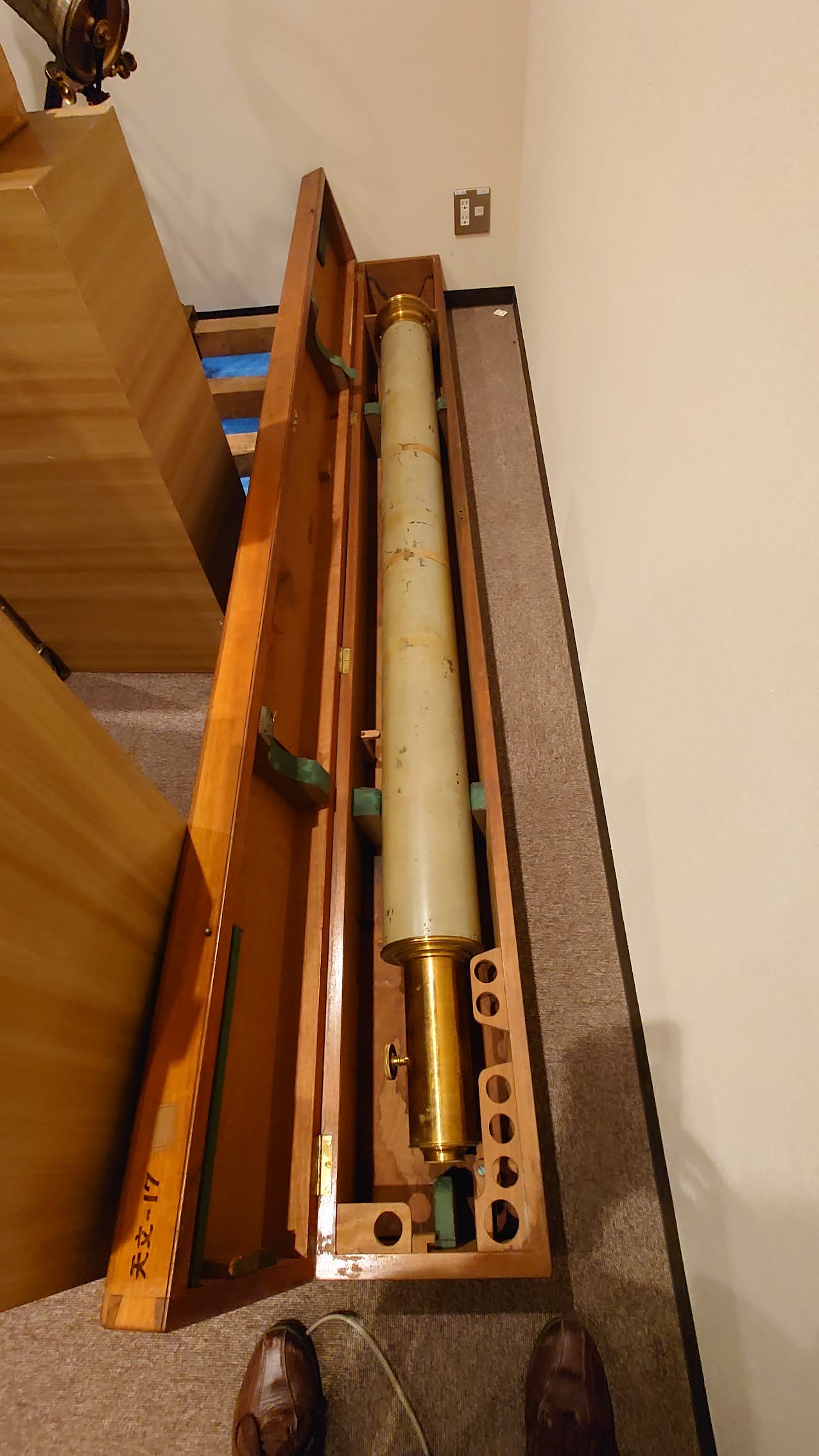 以上が、本望遠鏡に関してわかっていることのほぼ全て、でして、入手時期や理由、費用などがわかっておりません。望遠鏡の状態は良好で、長いこと油紙につつまれ、倉庫に保管されていました。予科石神井キャンパスの天文台は昭和8年以降は記載がなくなっており、その頃から使われていなかったのではないかと推測しております。また、会社および大学名から、1908年から1920年までの間に発注されたもの、と思われます。