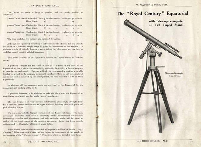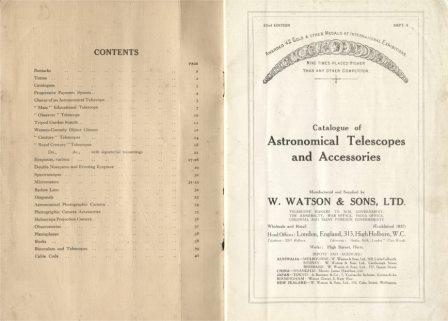 Watson & Sons社の望遠鏡を保有しているケンブリッジ大学博物館に問い合わせたところ、Watson & Sons Ltd.という社名は1909年以降であることを教えていただきましたが、このような天文台用の大型望遠鏡のカタログは残っていないとのことです。