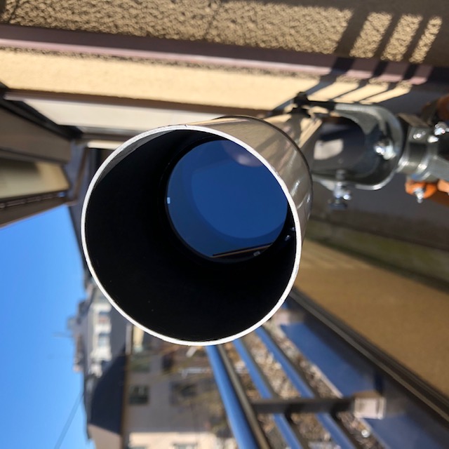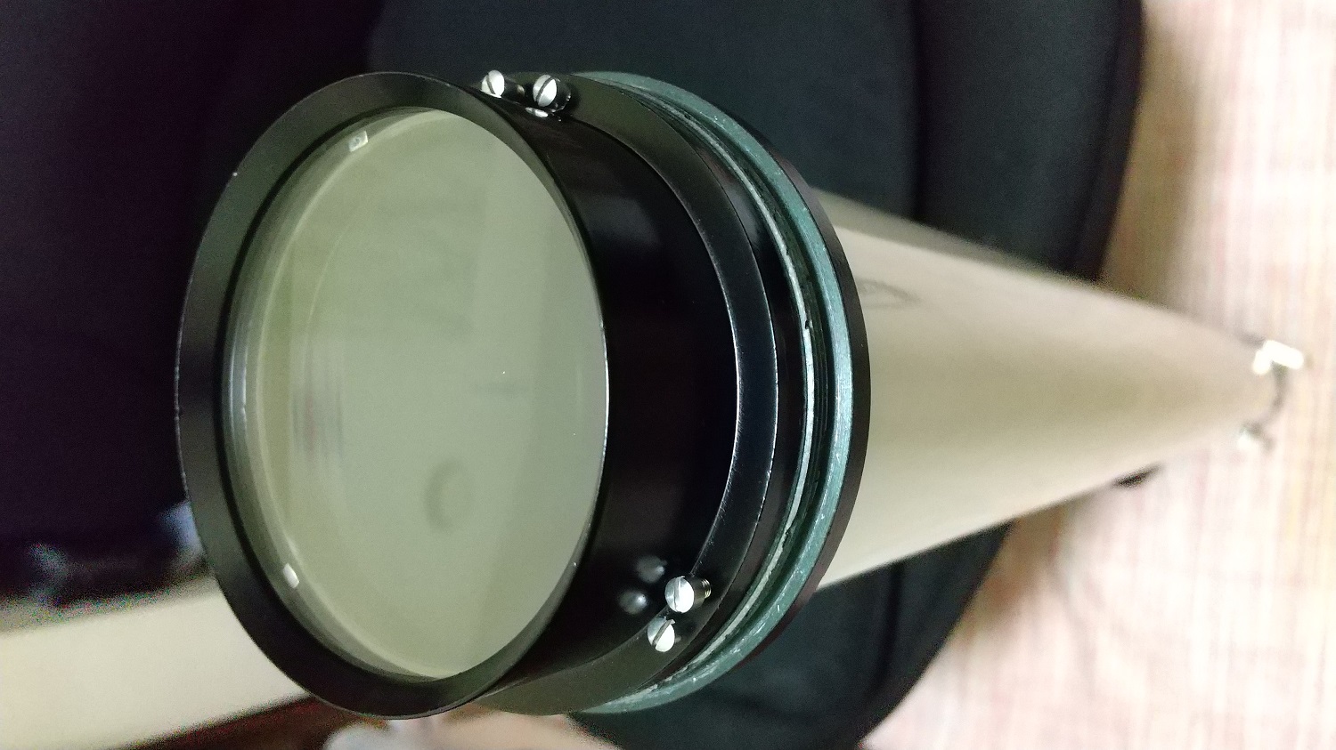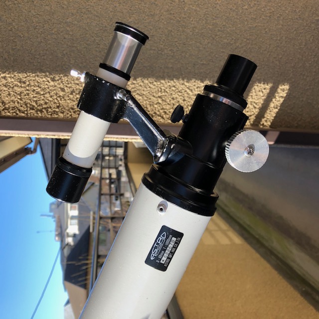 付属していた今は懐かしい「すり割り式」の24.5mm径のアイピースアダプターが頼り気なかったので、現行の31.7mm径のネジ止め式のアイピースアダプターを使って観望しましたが、おでこがファインダーの覗き口に当たってしまいます。