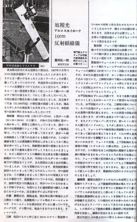 40年以上前に、望遠鏡が写った記事を拝見したことがありました。なぜかその時は、ミザールH100なんだ、と思ったものでした。その頃は、当然ながらレトロ望遠鏡資料館などは有りませんから、ファインダーが2脚式なので、単純にそう思ったのかもしれません。・・・でも同資料館のアスコ196*を見ると、接眼部にヘリコイド式も有ったようです。もしかして、その写真はヘリコイドだった?・・なわけないですよね!?